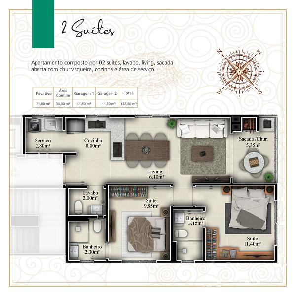 2 dormitórios (2 suítes)
